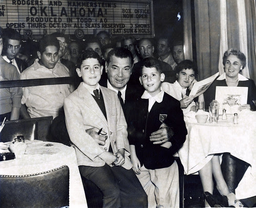 Champion of the World, Jack Dempsey. I was a little bit of a practical joker. I had a fake pack of chewing gum that snapped on your finger when you pulled a piece of gum out. I did it to a man at the next table—he turned out to be a friend of Jack Dempsey. He asked me to play the trick on Dempsey. He called him over to the table and I offered him the gum—snap. He laughed…and my brother and I ended up on Jack Dempsey’s lap and this photo was taken. Notice that the movie, “Oklahoma” had just opened and was playing across the street. A typical New York crowd gathered at the window to catch a glimpse of Dempsey and they help make this photo complete. I’m in the dark jacket and my brother, Ron, is in the light jacket and tie."
